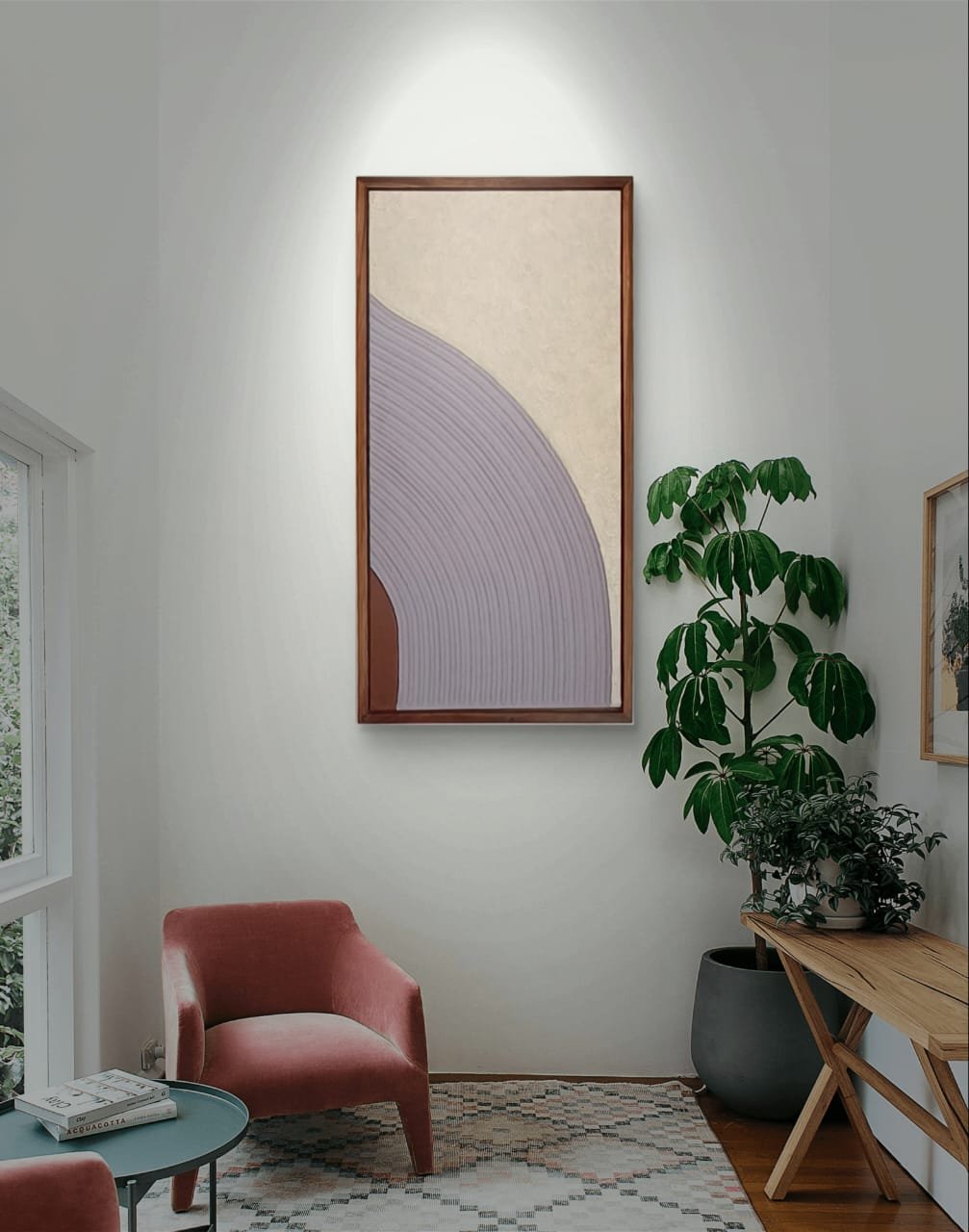 Transform your space with this handmade textured abstract wall art, designed to bring a sense of sophistication and calm to any interior. Featuring a modern geometric arc pattern in neutral shades of beige, brown, and soft lavender, this artwork blends minimalism with texture, making it a versatile piece for both contemporary and classic décors.